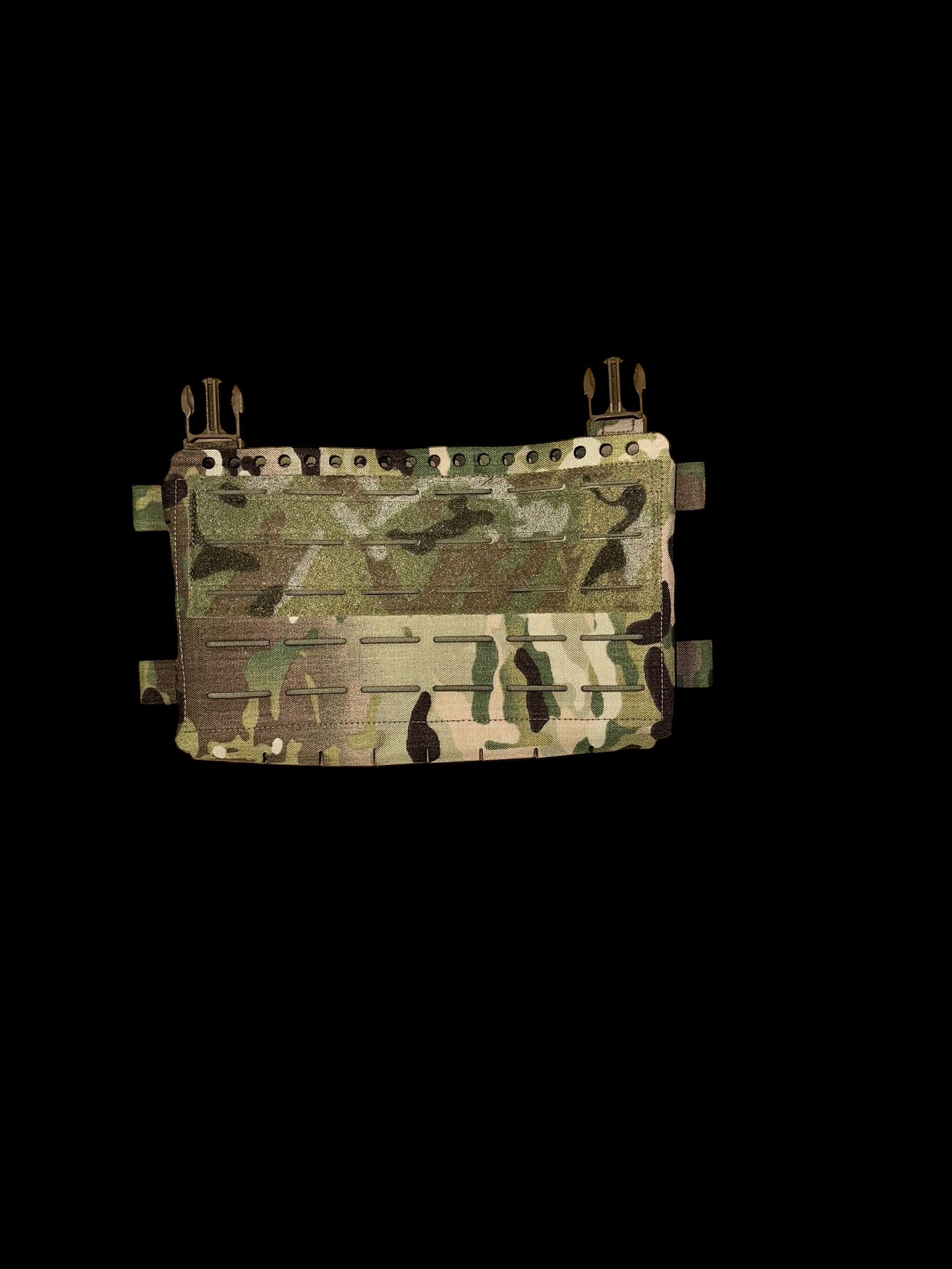 The placards are cut and reinforced to accept snap‑in Kydex inserts for rigid magazine retention when hard security is required, while the elastic/soft body preserves fast, positive access when speed matters. the placard is also designed to take elastic shock cordage for users who prefer minimal top mag coverage. They also feature reinforced attachment points to accept Pangolin‑style flaps for added cover and retention. Placards can be added to build low‑profile micro chest-rig configurations, and adjustable top‑strap geometry provides compatibility across varying plate‑carrier brands and sizing.
